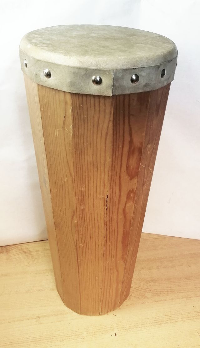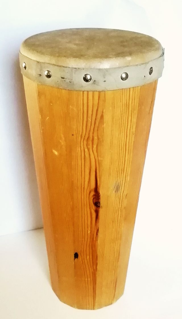 Keményfa hasábokból készült kúpos, hasáb forma dob, a dobtestre feszített kecskebőr vibrátorral.