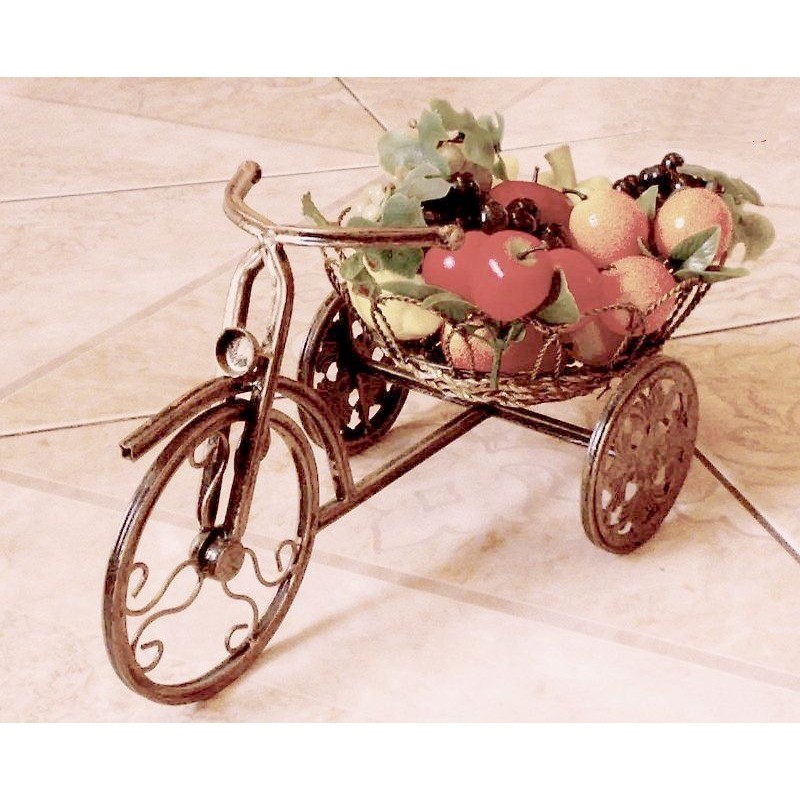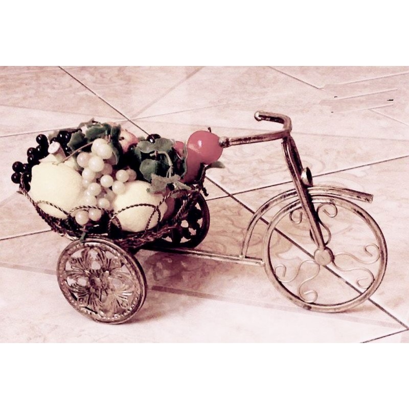 Gyümölcsöt tartó tricikli formájú állvány díszes fém elemekkel.