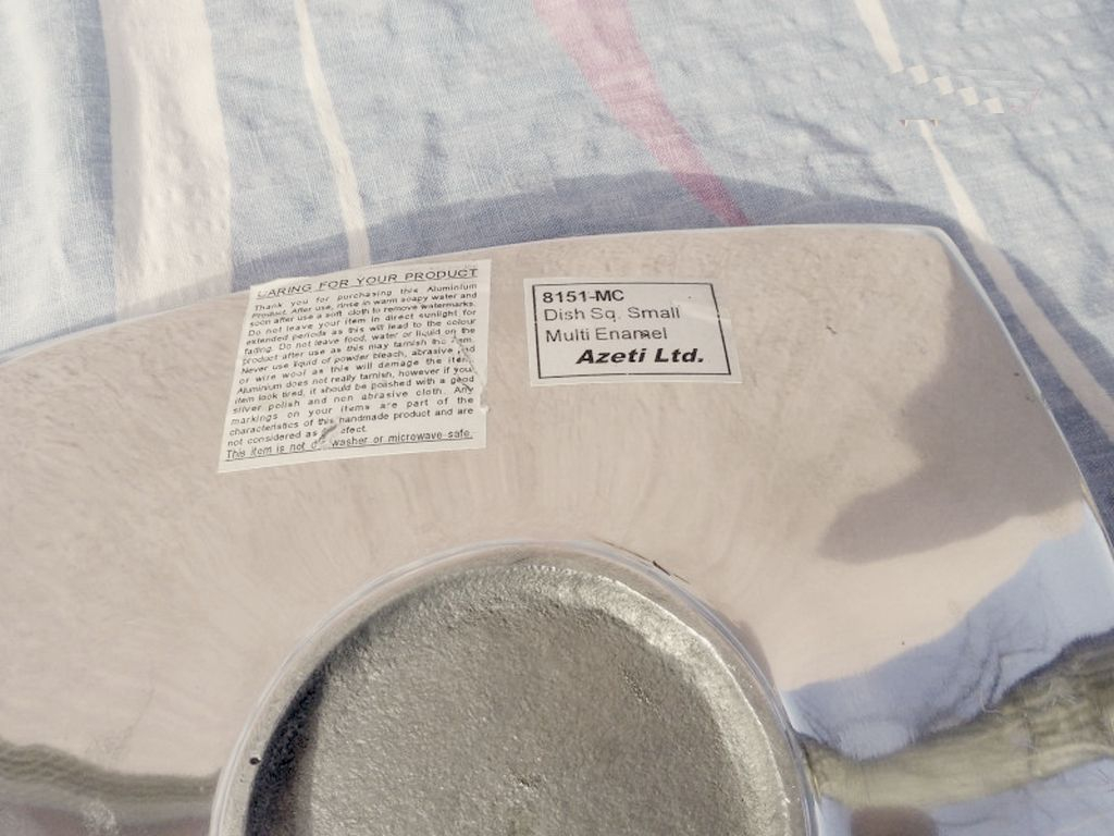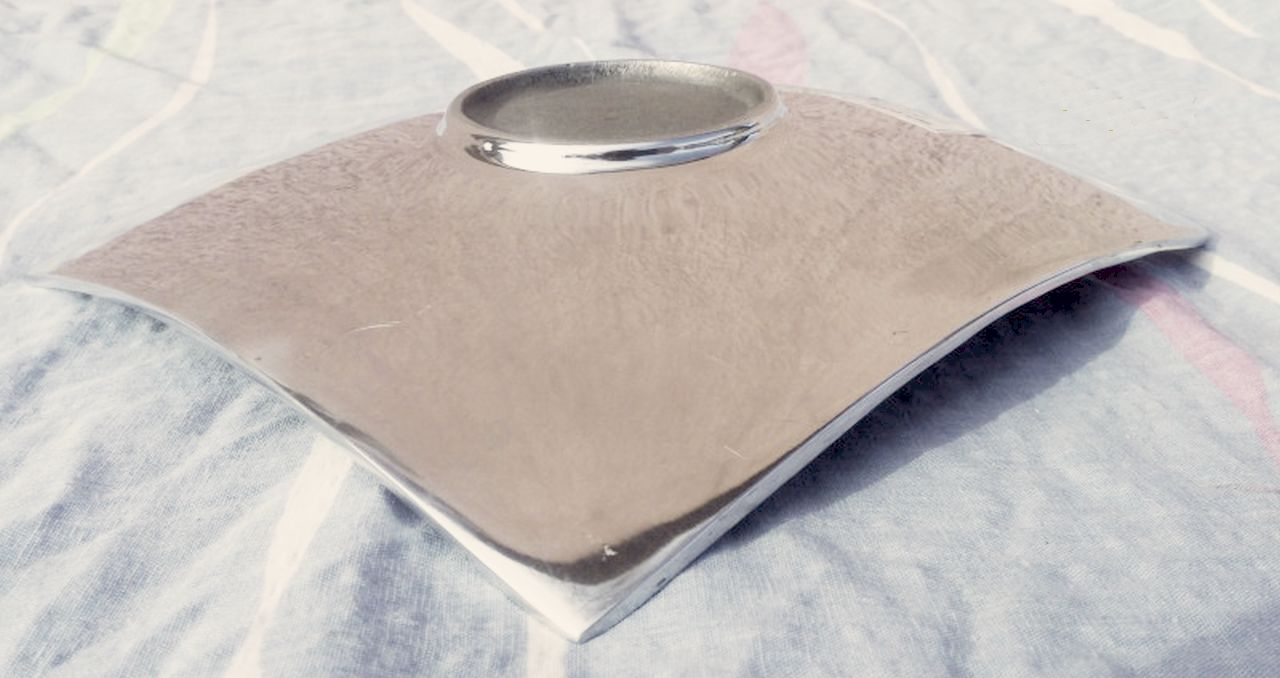 Újszerű állapotban fennmaradt, polírozott öntött alumíniumból készült, felületén színes négyzetekkel mintázott kínáló.