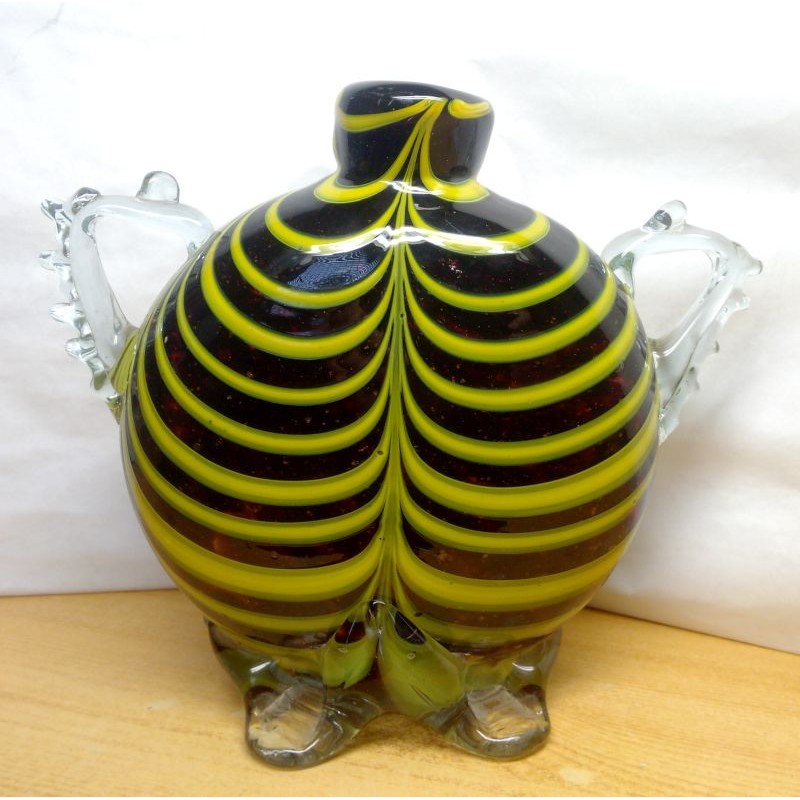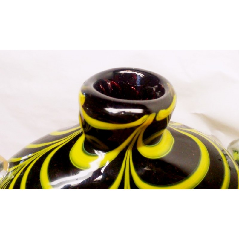 Jellegzetes a művészre jellemző viktoriánus stílusú fodrozott lábakonálló, egymásba áttűnő feketének tűnő, de a valóságban sötét barna, és zöldessárga színekkel, csipkézett folyatott fülekkel. Különleges, kellemes színvilágú ritkaság, a Cseh kézműves ipar remekműve, a Bohémia hagyományokat őrző Welz Glass motívumokkal.