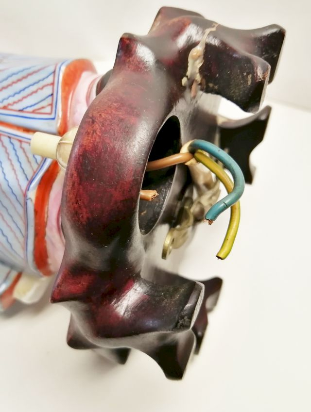 Asztali, vagy éjjeliszekrényre való lámpa kínai tudós porcelán figurával!Díszes festett mázas porcelán figurás lámpa művészien kidolgozott dekorációval, ernyő nélkül, faragott fa talapzaton, amelynek két lába restaurált. A működőképességhez újra kell vezetékezni és elektronikai szempontból átvizsgálni.A képen látható patinás állapotban postázom.Értékes retró lakberendezési tárgy, amellyel kiválóan emelheted gyűjteményed színvonalát.Ajánlom gyűjteménybe, kiállítási célra, vagy a lakásod díszeként.