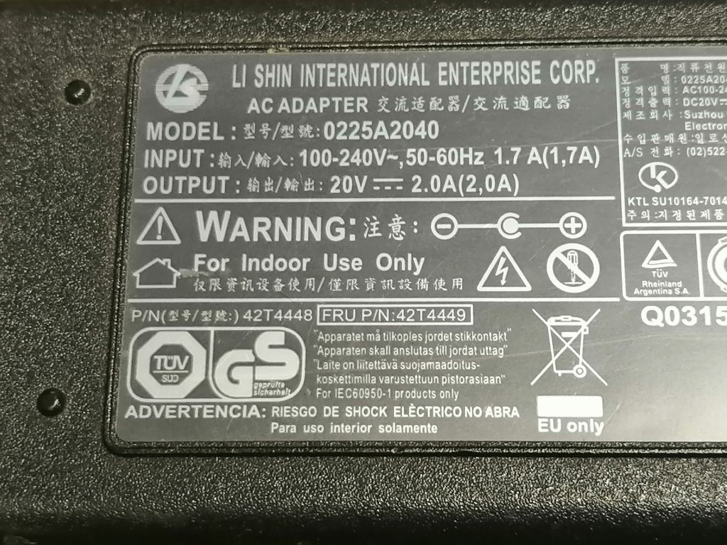LI SHIN 0225A2040 Laptop Adapter 20V. 2A. Lenovo, Advent, Philips